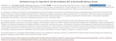 On April 29th, 2009: BioNeutral appointed Dr. Steven Goldmann to their advisory board and these were his words (click on picture to enlarge, words underlined in red) - Dr. Goldmann served on the CDC as advisor ( read full story here):